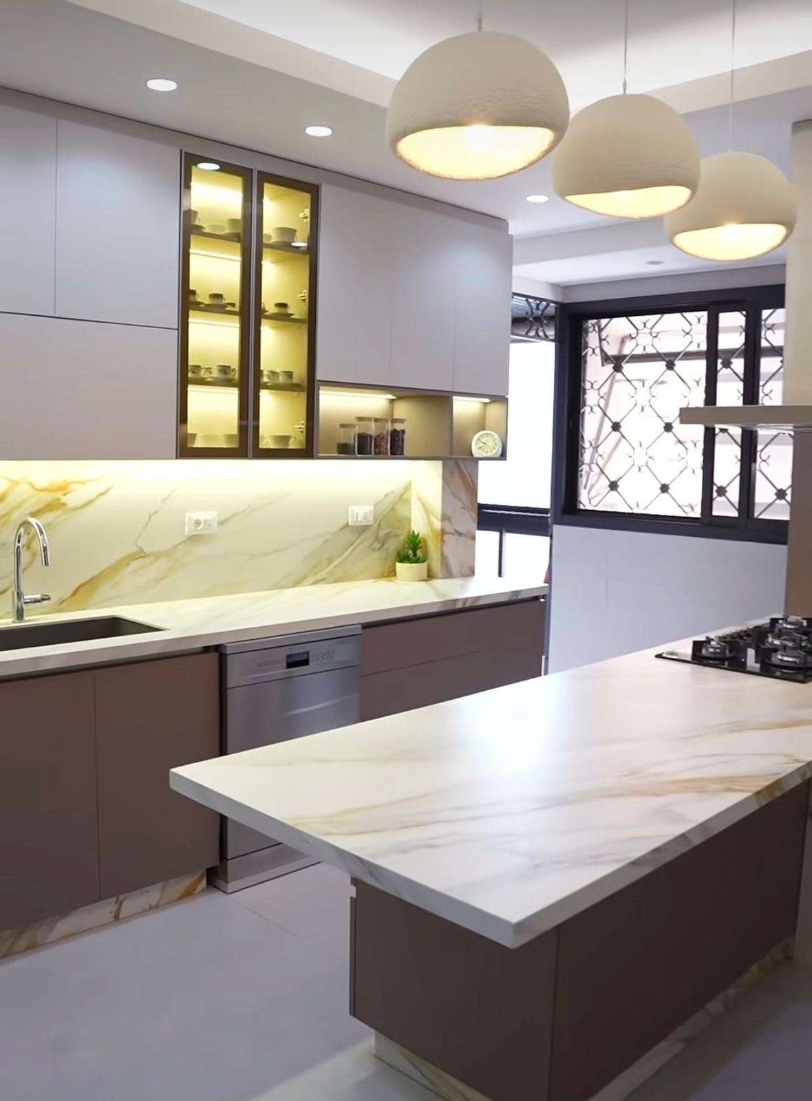 High-quality quartz and ceramic surfaces selected for durability and elegance.